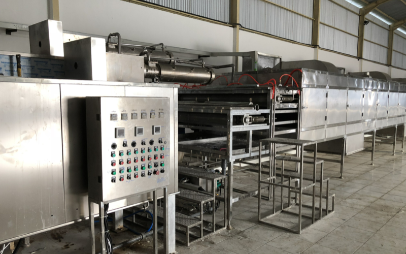 網(wǎng)帶將擠出的粉絲帶入預干燥機,對粉絲表面進(jìn)行干燥,使其不粘連;