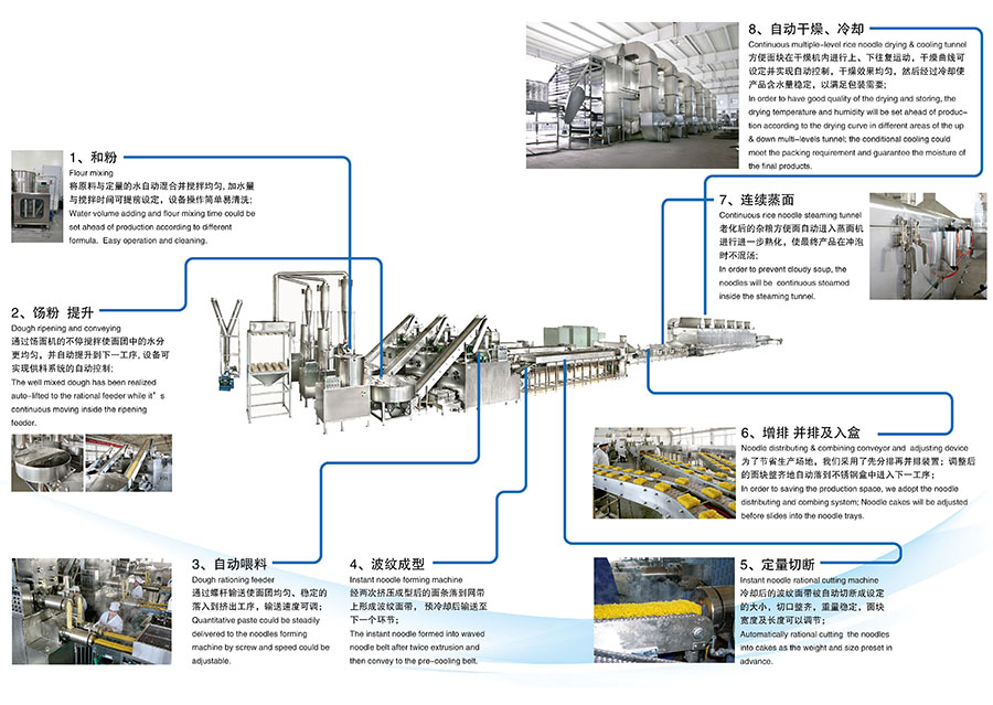 本設備適用于多種雜糧谷物,如玉米粉、蕎麥粉、大米粉、小麥粉等,生產(chǎn)混合谷物的非油炸方便面,無(wú)須更換設備,只需調整參數,即可生產(chǎn)玉米方便面、蕎麥方便面、燕麥方便面以及具有不同地域特性的不同雜糧方便面產(chǎn)品。產(chǎn)品可煮可泡,食用方便,口感滑爽Q彈,沒(méi)有雜糧的粗糙口感,為廣大消費者提供了即美味營(yíng)養又方便的食品。滿(mǎn)足人們對食品營(yíng)養、方便、美味的三大訴求。